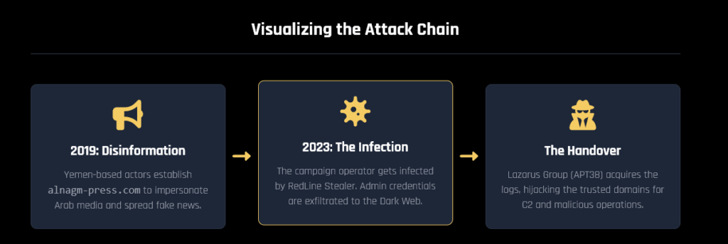 Hudson Rock Report: The Infostealer to APT Pipeline HUDSON ROCK Cybercrime Intelligence Back to Home APT Threat Intel Disinformation The Infostealer to APT Pipeline: How Lazarus Group Hijacked a Yemen Disinformation Network Hudson Rock investigations reveal how a single infected computer in Yemen served as the bridge between a 2019 disinformation campaign and North Korea’s […]