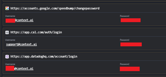 Despite their sophisticated persona management, the actor exhibits severe credential recycling. This vulnerability allowed analysts to definitively link disparate accounts back to a single operator. The passwords extracted by LummaC2 fall into distinct, functionally segregated groups.
